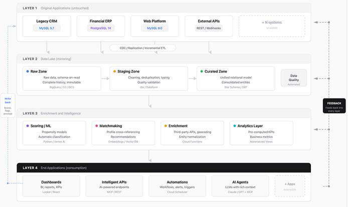 基于精选区的整合,该层运行多种流程添加信息:评分模型计算倾向性、相关性与风险;匹配算法交叉比对个人资料生成推荐;外部增强功能添加第三方数据(地理编码、市场数据、补充记录);业务指标预先计算以便快速使用。
