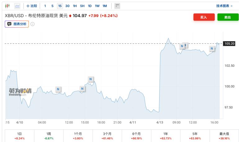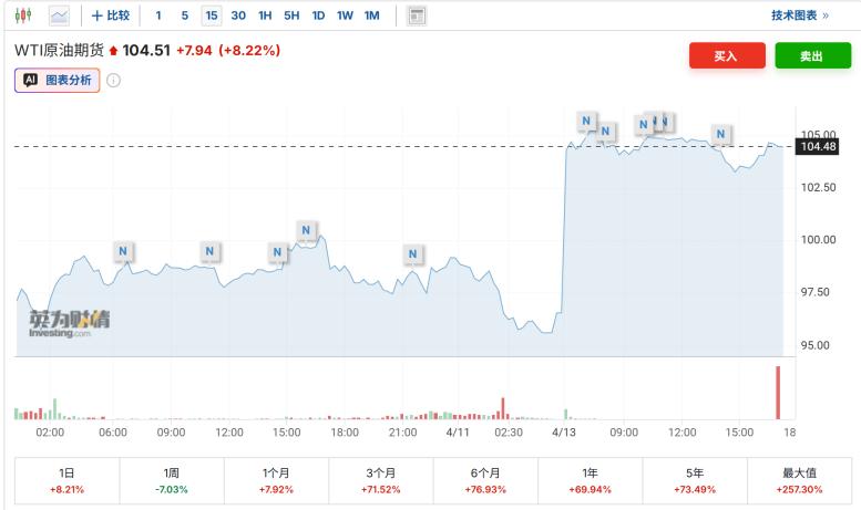 霍尔木兹海峡再度关闭后,4月13日国际油价再次突破每桶100美元。截至北京时间17时23分,5月交货的WTI原油价格报每桶104.51美元,涨幅7.94%;布伦特原油现货价格报每桶105.97美元,上涨7.99%。