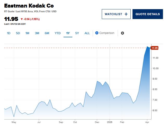 伊士曼柯达公司股价上周触及每股12.46美元的52周新高,较一年前4.94美元的低位累计涨幅近100%;与2020年3月疫情期间1.55美元的历史低点相比,涨幅更是接近8倍。尽管这一价格仍远低于1999年78美元的巅峰,但对这家2012年申请破产保护、去年还因债务问题遭质疑的企业而言,已标志着其出人意料地重回正轨。
