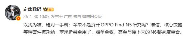 此前,博主@定焦数码曾爆料,苹果在研发过程中对OPPO Find N5进行了拆机研究,铰链、精密件等设计被苹果借鉴,甚至与Find N6高度重合。