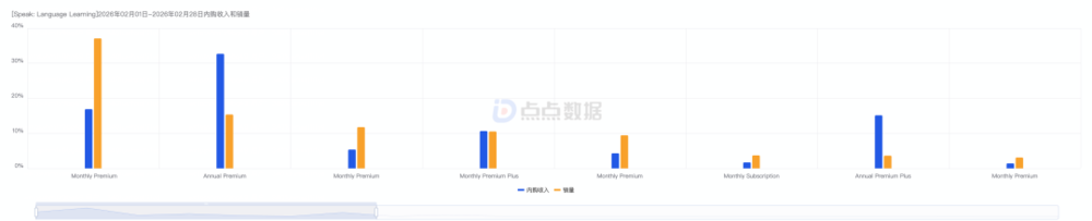 相比之下,Speak更擅长课程体系建设,高付费门槛过滤掉低意愿用户;即使在用户涌入最多的2月,年订阅收入占比仍超50%,与1月、3月相比无明显波动。