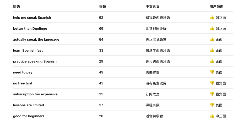 从用户评论中可清晰看到美国市场增长的关键:用户使用Speak的核心需求是练习西班牙语口语,“Spanish”与“Speak/Practice”等关键词高频绑定出现。