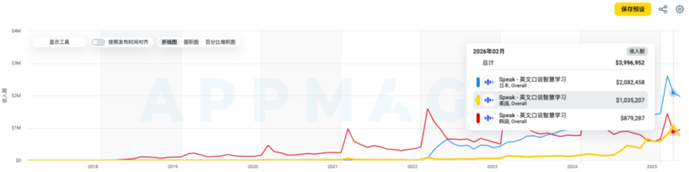 但今年Speak的市场格局出现明显变化:除日韩两大主力市场外,美国市场流水增幅尤为突出,2月美国分成后收入已超越韩国,成为第二大收入市场。