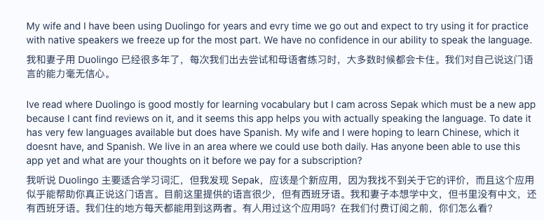 另一个高频词汇是Duolingo,“better than Duolingo”短语出现66次,排名第二。Reddit上有用户分享:自己和妻子用Duolingo学了数年西班牙语,但遇到母语者时仍无法顺畅交流,缺乏开口自信,因此转向Speak尝试。