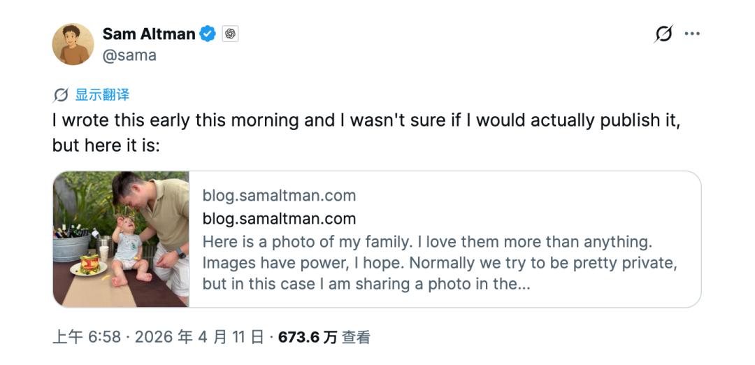 近期,奥尔特曼位于旧金山的住宅在48小时内连续遭遇燃烧瓶和枪击袭击,所幸无人伤亡。嫌疑人被捕时甚至扬言要烧毁OpenAI总部。面对极端威胁,奥尔特曼发布博客长文,罕见分享家人照片,呼吁冷静,希望用亲情的力量化解仇恨。