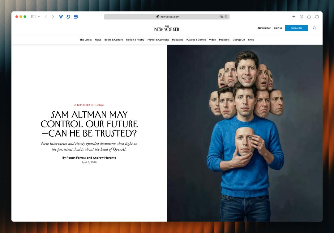 袭击发生前,《纽约客》一篇题为《Sam Altman May Control Our Future, Can He Be Trusted》的深度报道已将他推向风口浪尖。文章历时一年半调研,采访超百人并获取大量私密文件,直指其权力野心与诚信问题。部分受访者用“反社会人格”形容他,杂志封面更以多面形象暗示其复杂性。