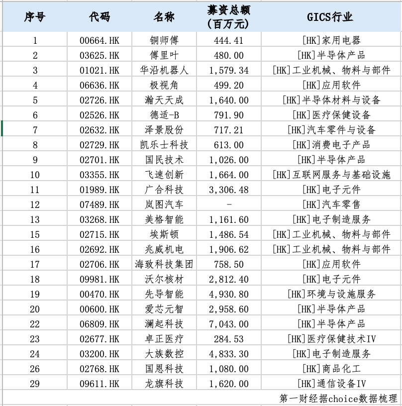 第一财经根据Choice数据统计,按上市日期计算,一季度共有29家企业成功赴港上市,其中CIGS行业划分下的半导体产品、材料与设备、电子元件、电子制造服务等高新技术领域企业达24家,募资总额436.37亿元。国产GPU龙头壁仞科技与天数智芯的相继上市,填补了港股在GPU领域的空白。