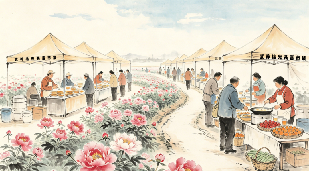 这一回,武养拾光共富市集走进了桃溪民丰村,和当地农户一起,在芍药花田旁铺开一个热闹又好逛的花间市集。