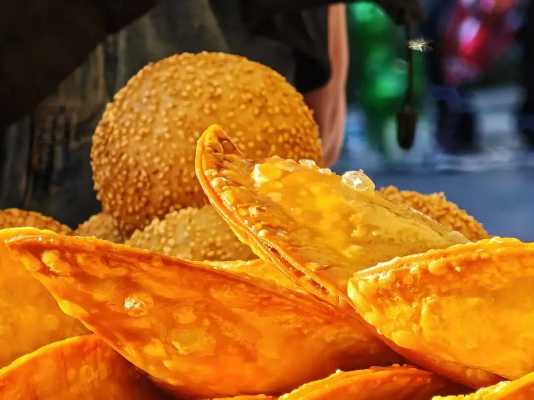 油饼在锅里滋滋作响,角干麦饼冒着热气,芍药青团裹着淡淡的草木香,干豆酥咬下去满口酥脆,还有来自桃溪山野的优质蔬果……都是武义人最爱的味道。逛累了,就在摊位前挑一挑,边吃边走,最是自在。