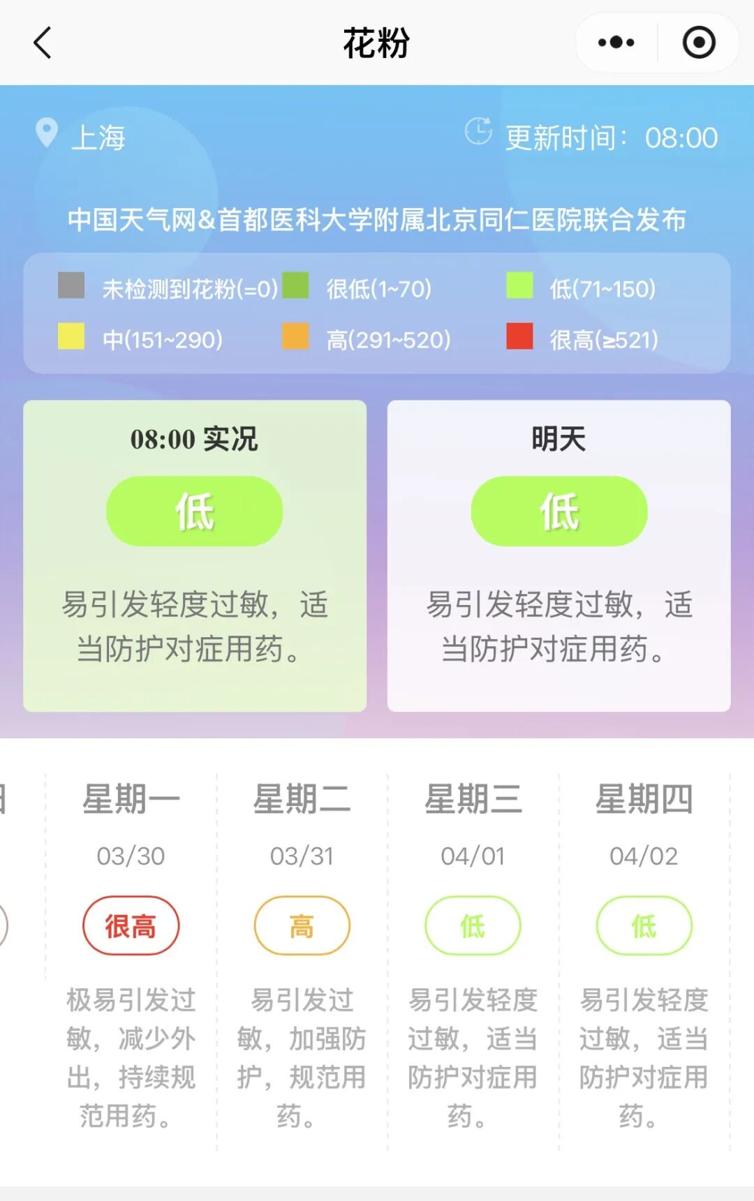 ?下载天气预报类App,查看每日花粉浓度预报。