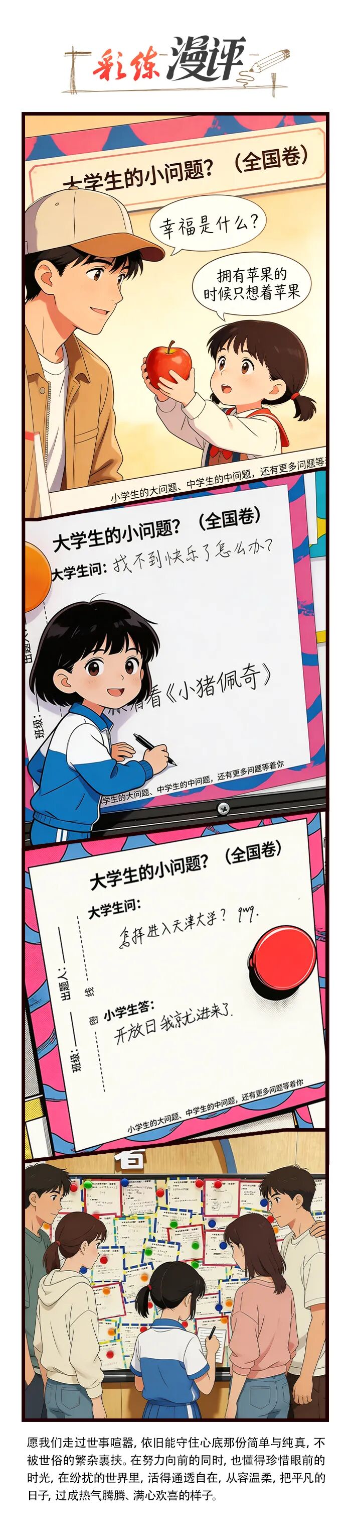 留言板上,满是当代人的真实心声:有人为成长感到焦虑,有人为学业烦忧,有人对快乐感到迷茫。那些曾让成年人纠结不已的人生难题,却被孩子们几句直白的童言瞬间点醒。“怎么能慢点长大?”“享受当下就好”;“找不到快乐”“看看《小猪佩奇》”;“幸福是什么?”“拥有苹果的时候只想着苹果”;面对中学生被数理化困扰,学长回应“试着对它们好一点”,更是道出了与生活和解的智慧。问题朴实无华,答案简单纯粹,却句句触动人心。