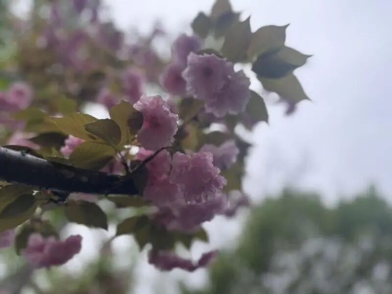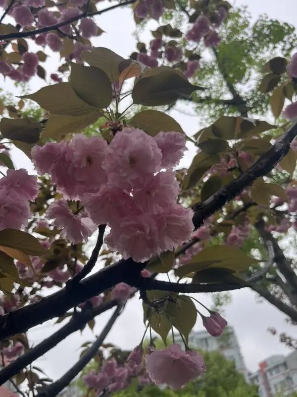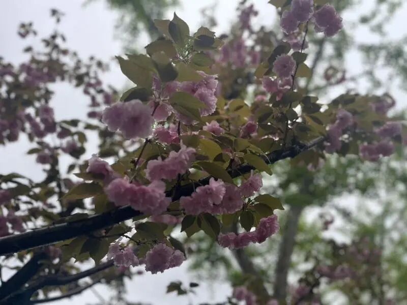 走在永清路上,两旁的关山樱十分引人注目。层层叠叠的重瓣花瓣饱满厚实,一簇簇开满枝头,远看像粉色云霞弥漫、薄雾缭绕;凑近看,每一朵都蓬松柔美,娇俏可爱。枝头还挂着雨后的晶莹水珠,更显得繁花清新滋润。旁边的银杏长出嫩绿新叶,扇形叶片在枝头舒展,清新的绿意与柔美的粉樱交织融合,描绘出层次丰富的春日美景。