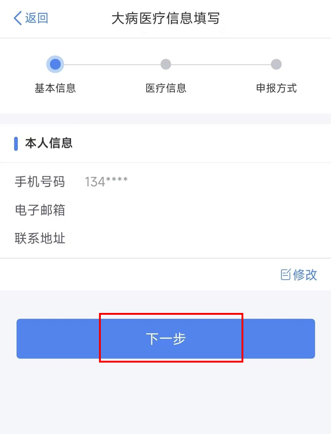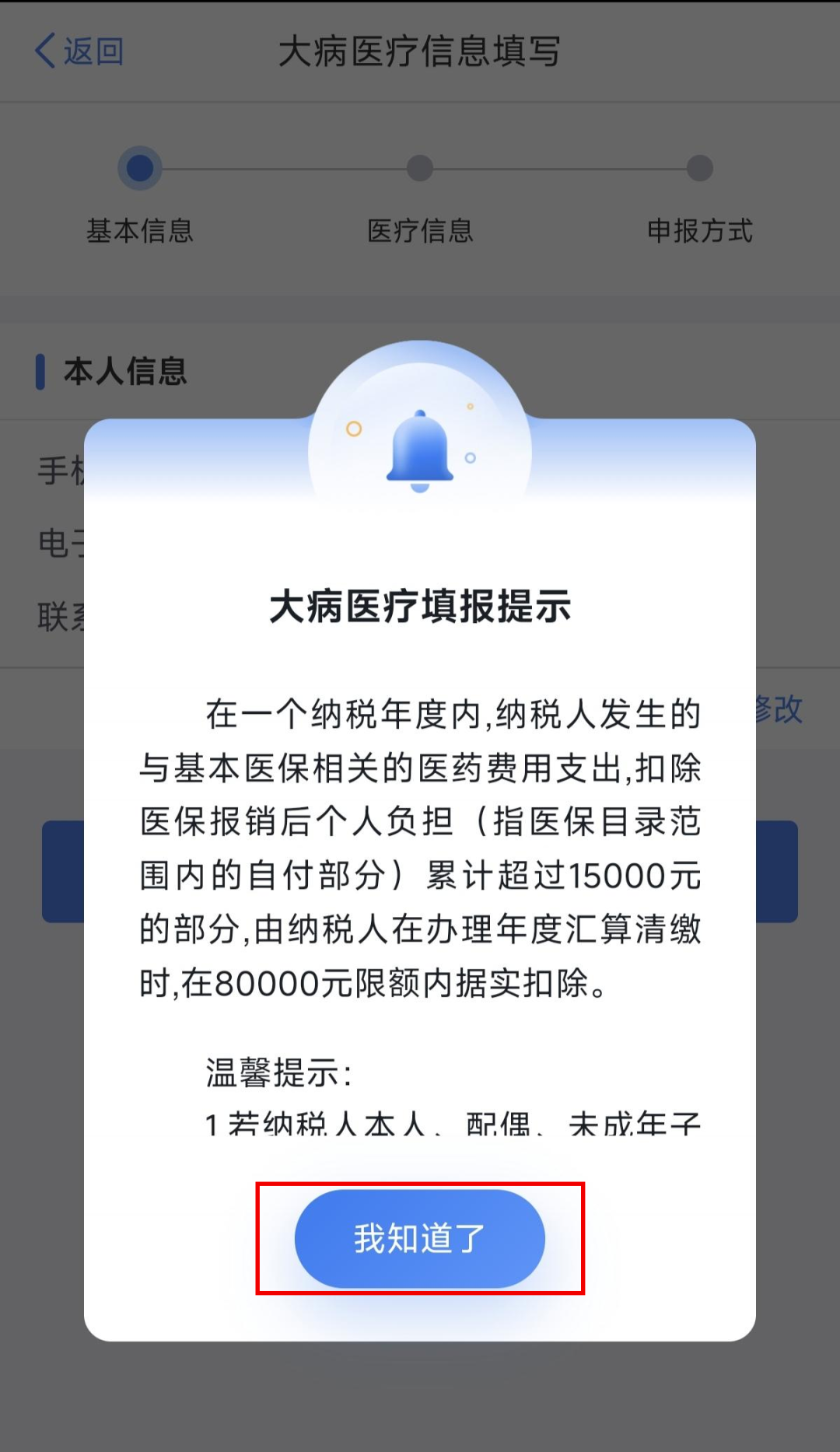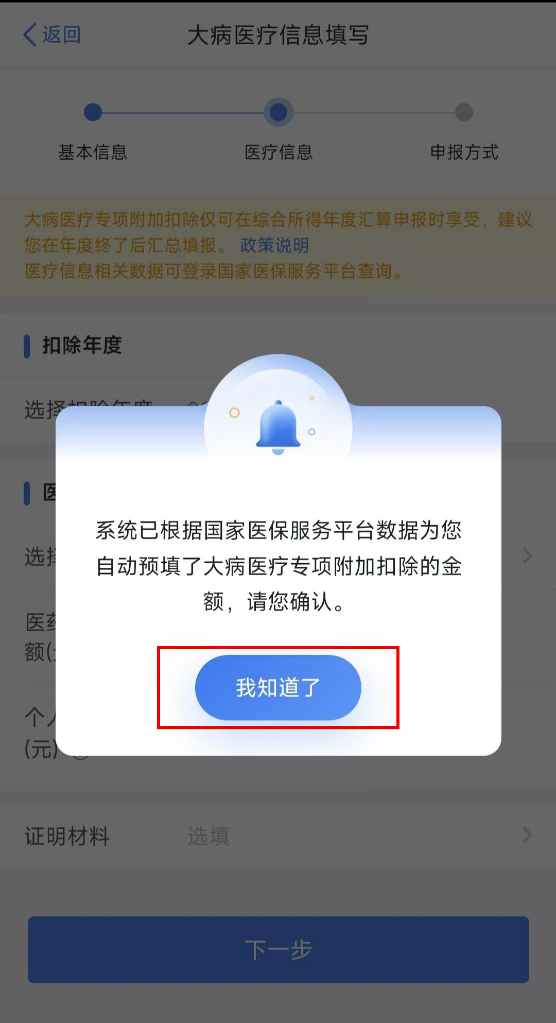 仔细核对页面上的姓名、身份证号等本人信息,确认没有错误后点击【下一步】,阅读“大病医疗填报提示”后,点击【我知道了】。
