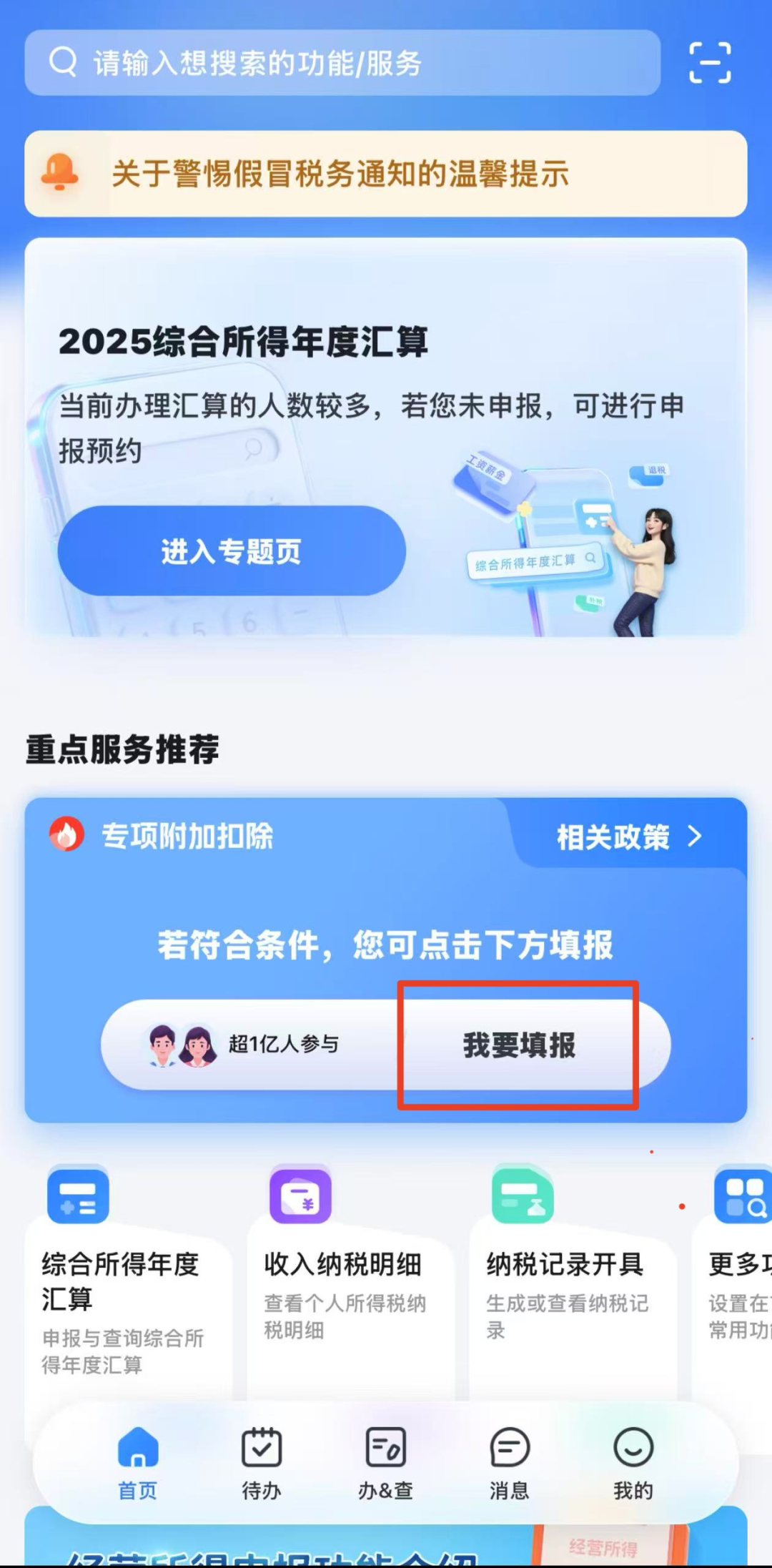 填报完成后,返回个税APP首页,进入【2025综合所得年度汇算】模块,系统会自动带入大病医疗扣除金额,按照流程完成汇算就可以了~