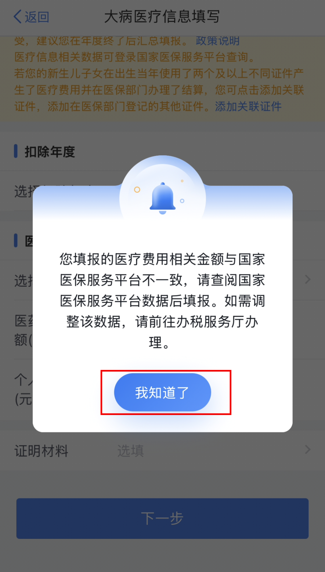 2.医疗费用数据由医保和税务系统联网核验,一定要如实填报,避免影响个人纳税信用;如果填报数据有误,系统会直接提示数据不一致;如果数据有误,请携带就医结算凭证等相关资料前往办税服务厅办理。