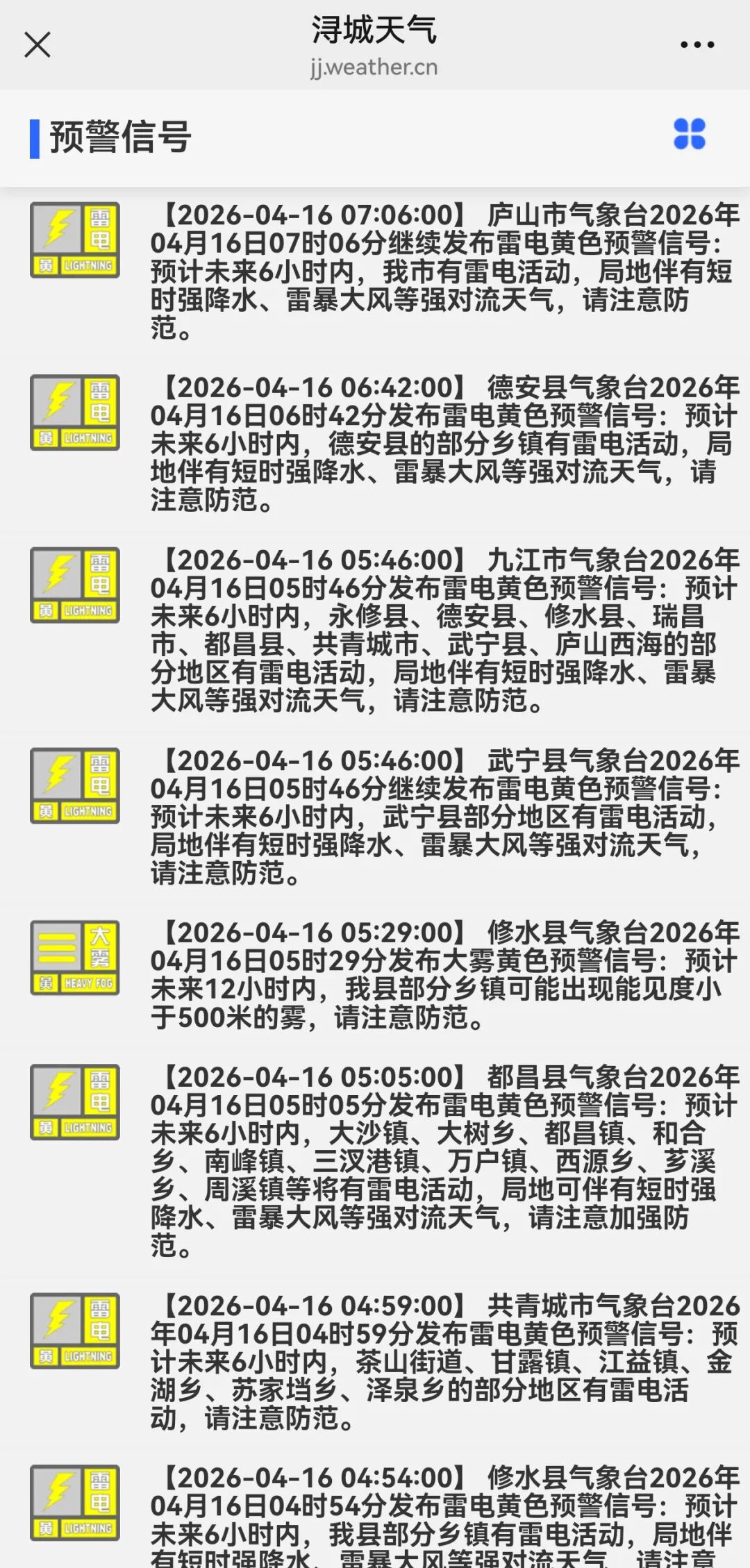 预计未来6小时内,永修县、德安县、修水县、瑞昌市、都昌县、共青城市、武宁县、庐山西海的部分区域将出现雷电活动,部分地方还可能伴随短时强降水、雷暴大风等强对流天气。