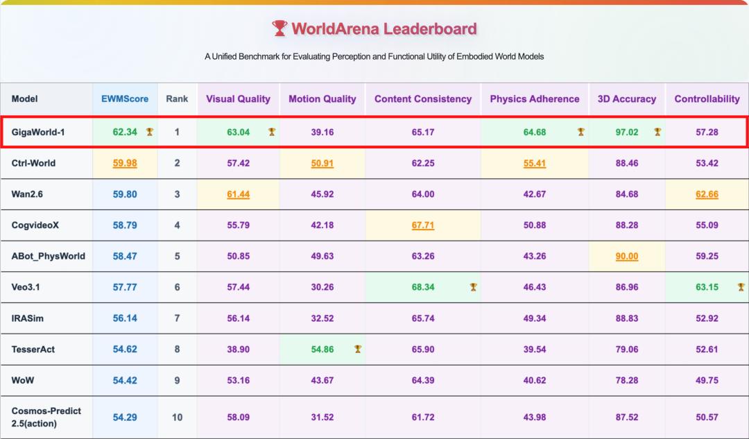 GigaWorld-1在世界模型领域权威评测基准WorldArena中,击败谷歌、英伟达、阿里等国际科技巨头与学术机构的模型,登顶全球榜首。