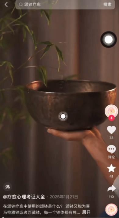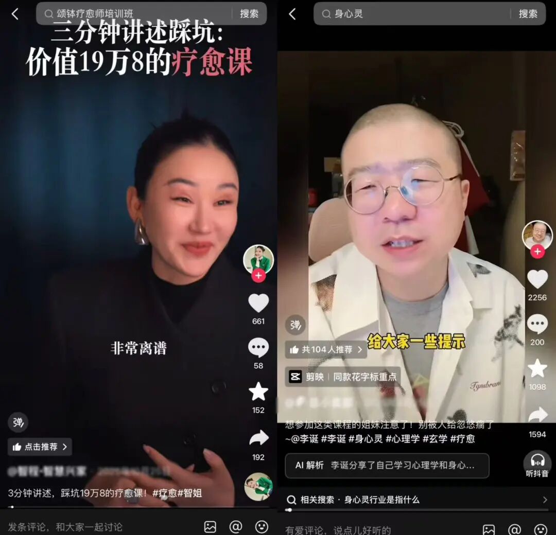 最后,从业者的“专业话术”也起到了推波助澜的作用。“β波调节”“矿石元素融入”“身心灵对齐”等专业包装,让消费者难以判断真伪。平台也会向用户推荐大量相关内容,因此疗愈视频在推荐机制下获得大量曝光,进一步放大了市场需求。