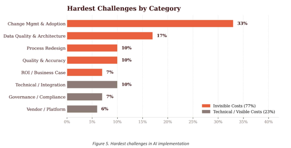 AI应用的最大挑战与技术无关。变革管理、数据质量、流程重设计这些“看不见的成本”才是真正的拦路虎。61%的成功项目此前至少经历过一次失败,这些失败成本未计入最终投资回报率。
