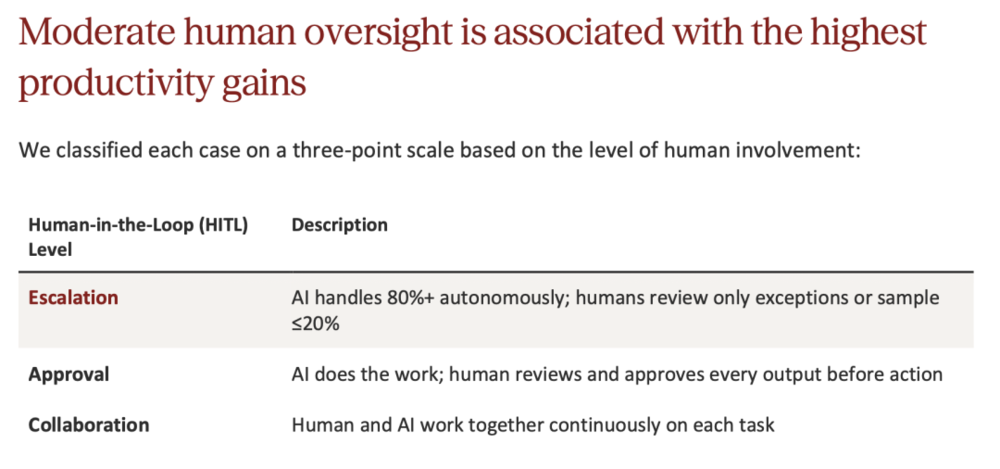 报告将运营模式分为三类:升级模式(AI自主处理80%以上,人工审阅异常)、审批模式(人逐条审核)、协作模式(人机持续合作)。升级模式的中位数生产力提升达71%,远超审批模式的30%。