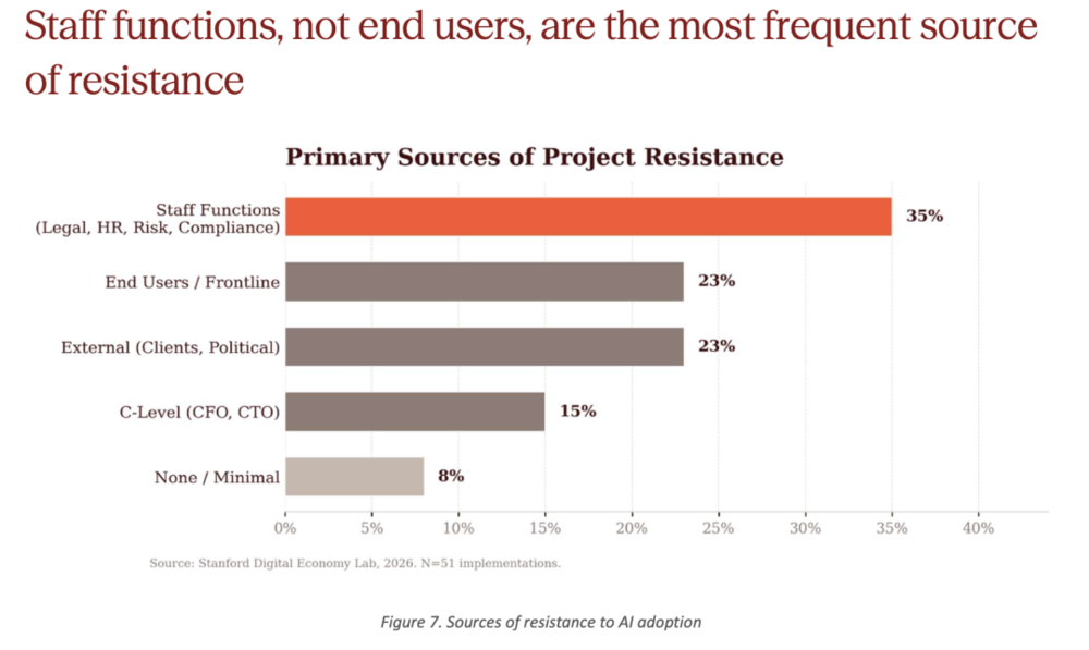 有趣的发现:法务、HR、风控、合规部门的阻力占比达35%,远超终端用户的23%。不同群体阻力逻辑各异——CFO要硬数据,法务担心责任,终端用户不信任不确定性,一线员工怕被替代。