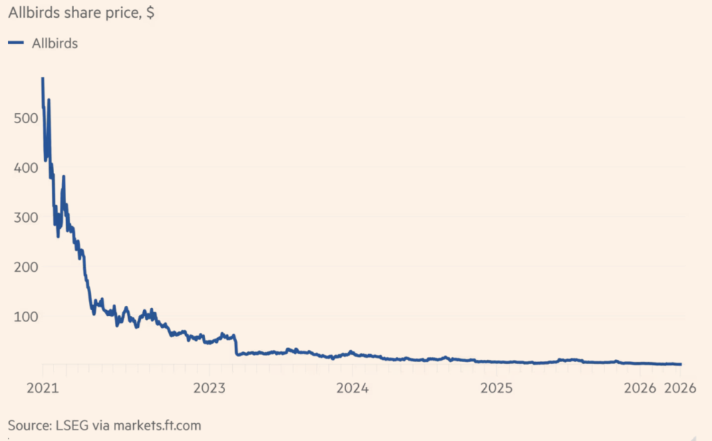 2022-2025年,Allbirds销售额从2.98亿美元降至1.52亿美元,跌幅近50%,始终未盈利,股价从巅峰近30美元跌至几美分。今年2月关闭全部美国全价门店,3月以3900万美元将品牌等资产卖给American Exchange Group,估值曾达40亿美元的独角兽最终“贱卖”。
