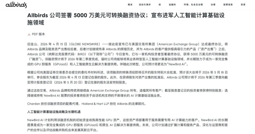 曾被誉为“硅谷足力健”的环保跑鞋品牌Allbirds,在业绩滑坡后做出惊人决定:以3900万美元卖掉品牌及核心资产,拿着新融的5000万美元转型为“NewBird AI”算力公司,计划成为“完全集成的GPU即服务(GPUaaS)和AI原生云解决方案提供商”。
