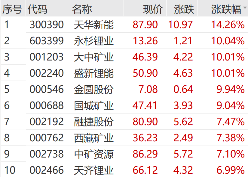 锂矿指数直线拉升,大中矿业、盛新锂能、金圆股份等涨停,天华新能涨幅超10%,国城矿业、融捷股份等纷纷跟涨。