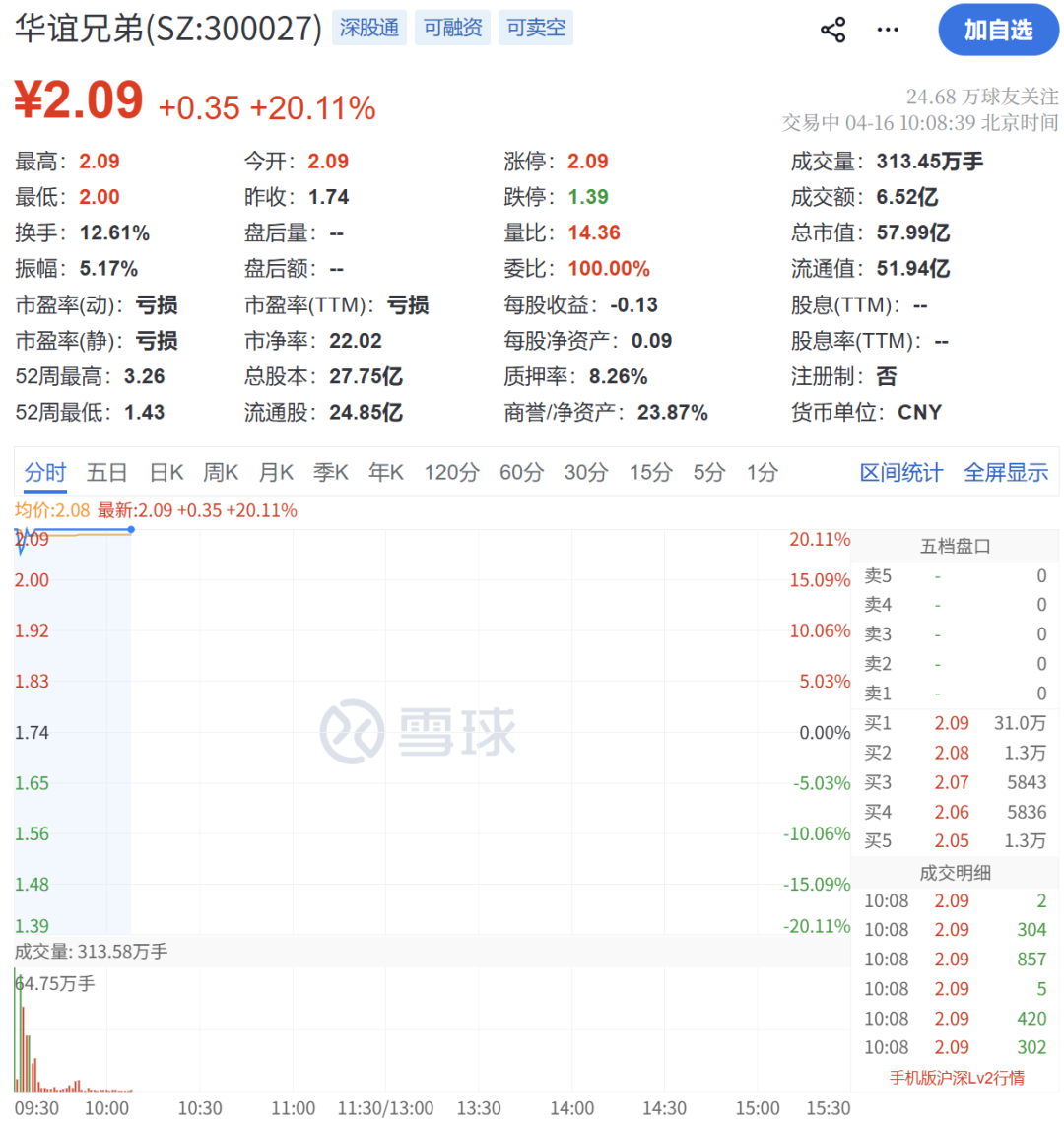 4月16日,华谊兄弟在竞价阶段就涨停,报2.09元/股;开盘后短暂打开涨停板,但很快又回封。截至发稿时,买一位置的挂单达到31万手。