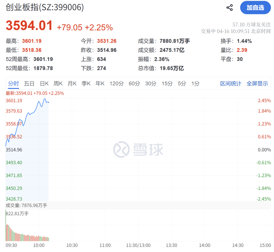 4月16日,A股主要股指开盘呈现红盘态势,上证指数微涨0.07%,创业板指上涨0.46%。随后市场震荡上行,创业板指表现强势,涨幅突破2%。