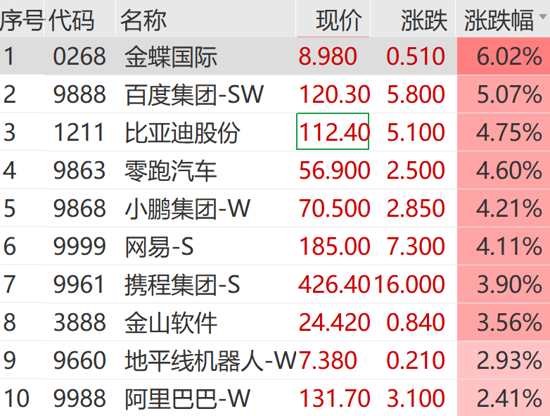 港股市场同步走强,恒生科技指数大涨超2%,金蝶国际、百度集团、比亚迪股份等成为恒生科技指数成份股中的领涨个股。