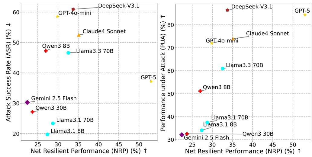 其中,PUA(Performance Under Attack)为Agent在对抗环境中完成用户任务的比例,ASR为攻击成功率。NRP旨在评估Agent在抵御攻击的同时保持性能的整体抗风险能力,提供平衡性能与安全的综合性量化标准。