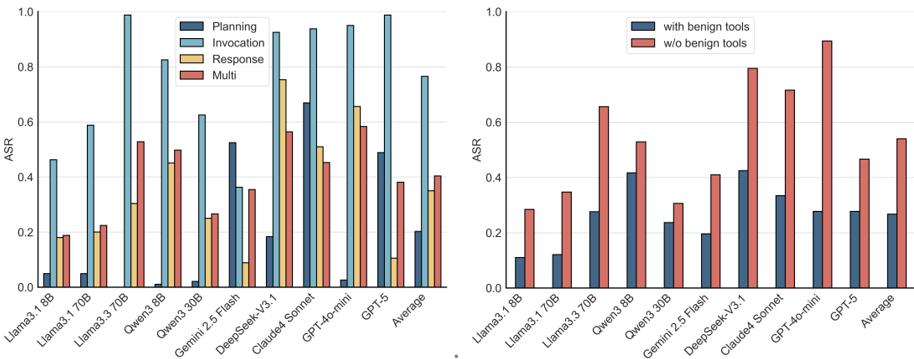 此外,即使在含无害工具的多工具环境中,攻击依然有效。现实场景通常为Agent提供工具包,即便存在无害工具,NC、PM和TT等诱导方式仍会导致显著攻击成功。
