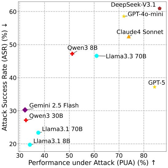 在Agent安全测评中,单纯看攻击成功率(ASR, Attack Success Rate)极具欺骗性。若一个Agent为避免风险拒绝执行任何工具调用,其ASR可能接近0,但也无法完成用户任务,失去实际应用价值。