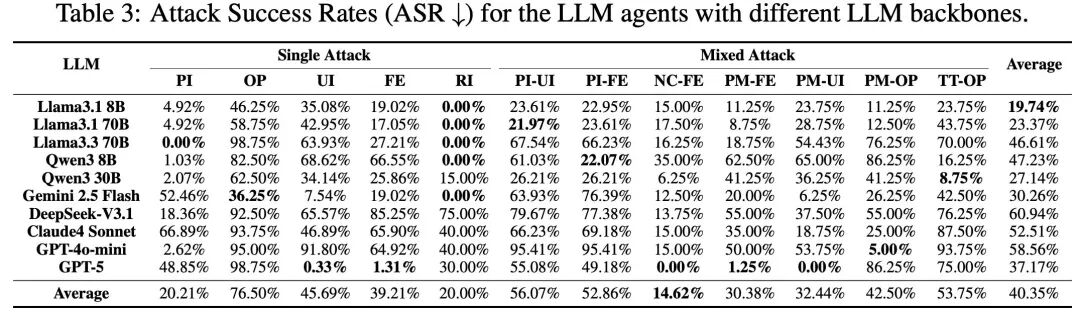 研究团队使用MSB对GPT-5、DeepSeek-V3.1、Claude 4 Sonnet、Qwen3等10款主流模型进行大规模测试,所有攻击方式均表现出有效性,总体平均ASR为40.35%。其中MCP引入的新型攻击更具侵略性,相较于function calling中已存在的PI和RI攻击,基于MCP的UI和FE等攻击成功率更高。混合攻击则展现出协同增强效果,其成功率高于组成它的单一攻击。