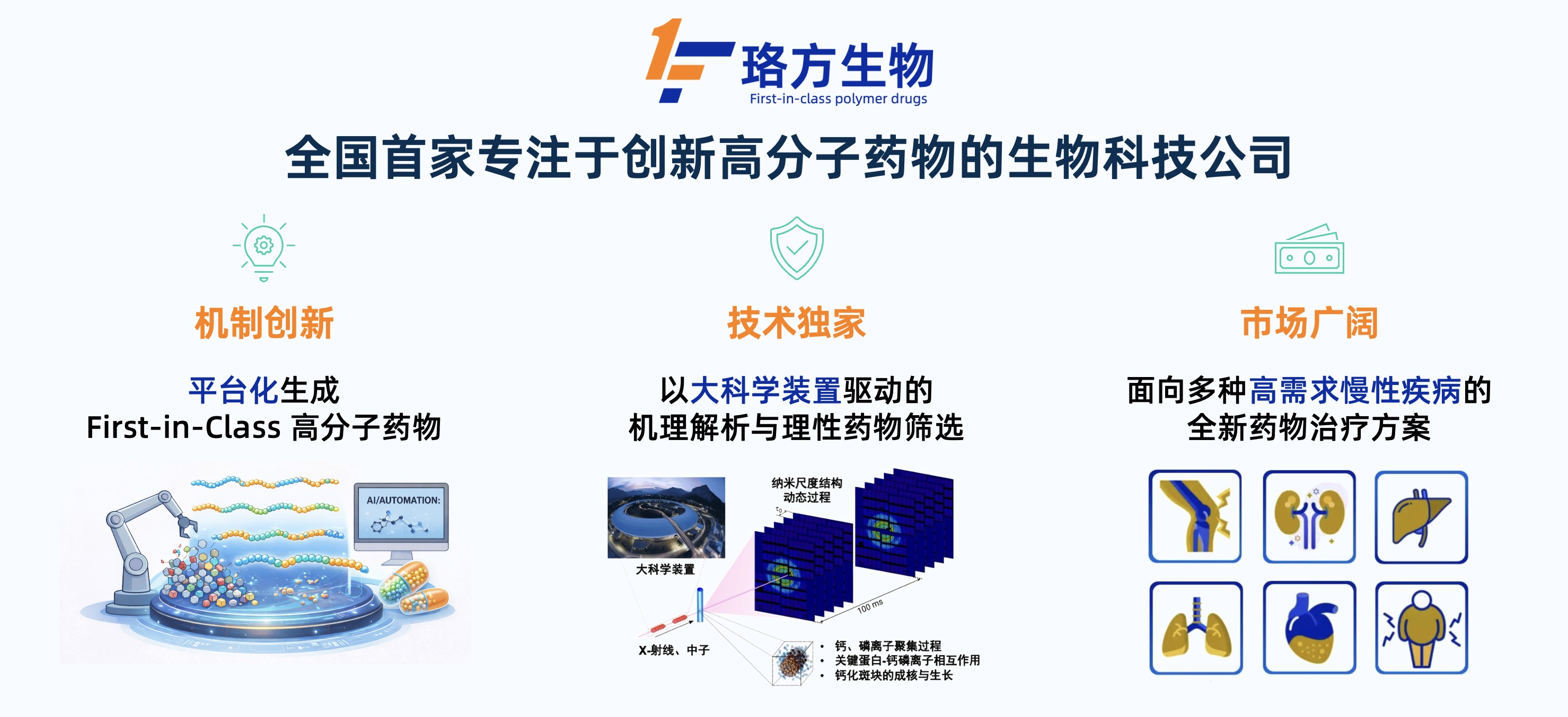 珞方生物依托AI及大科学装置的平台化创新能力,聚焦临床尚未满足且需求巨大的慢性疾病领域,开发First-in-class高分子药物