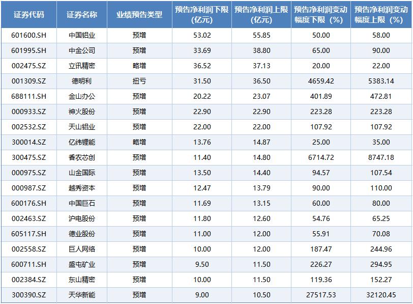 此外,德明利(001309.SZ)、金山办公(688111.SH)、神火股份(000933.SZ)、天山铝业(002532.SZ)等公司一季度归母净利润上限均超20亿元。