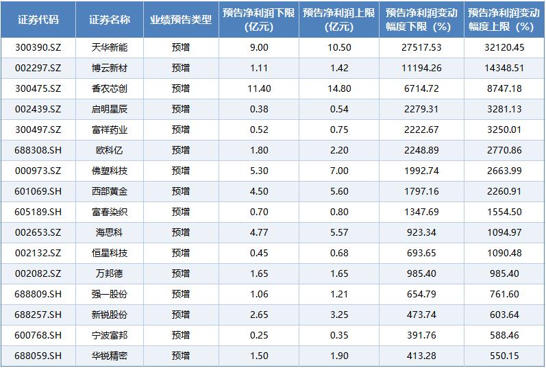 按预计净利润变动幅度上限,1家超300倍,2家超100倍,11家超10倍。天华新能(300390.SZ)预计一季度归母净利润9亿至10.5亿元,同比增长32120.45%,因储能与动力电池下游需求增长,锂电材料业务利润大幅提升。