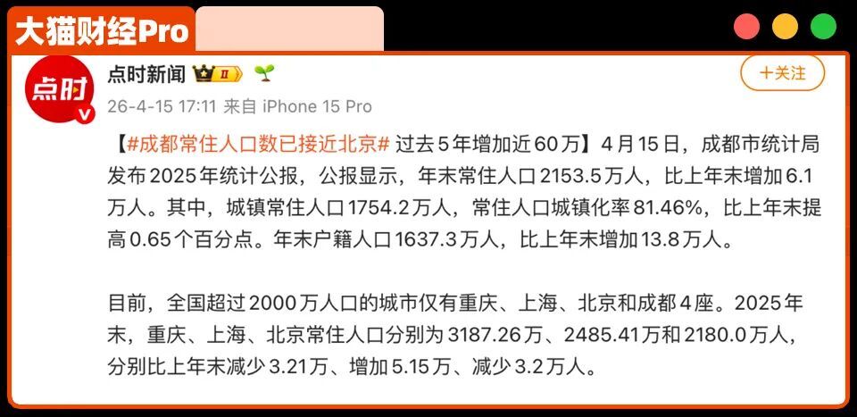 近日成都公布的常住人口数据显示,过去5年新增了60万人,常住人口仅比北京少26.5万,成为全国人口第四多的城市。