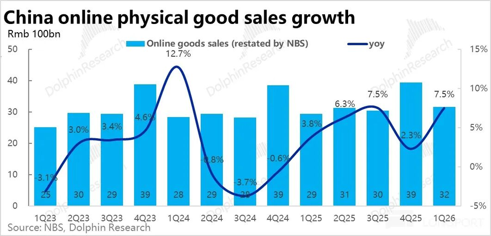 具体数据显示,3月线上实物零售额同比增长2.5%,较1-2月的10.3%明显下降,也低于25年12月至今年2月6.5%的加权平均增速。可见,3月线上零售增速较春节期间的放缓幅度比整体社零更为显著(部分原因是1-2月线上实物销售处于较高峰值)。