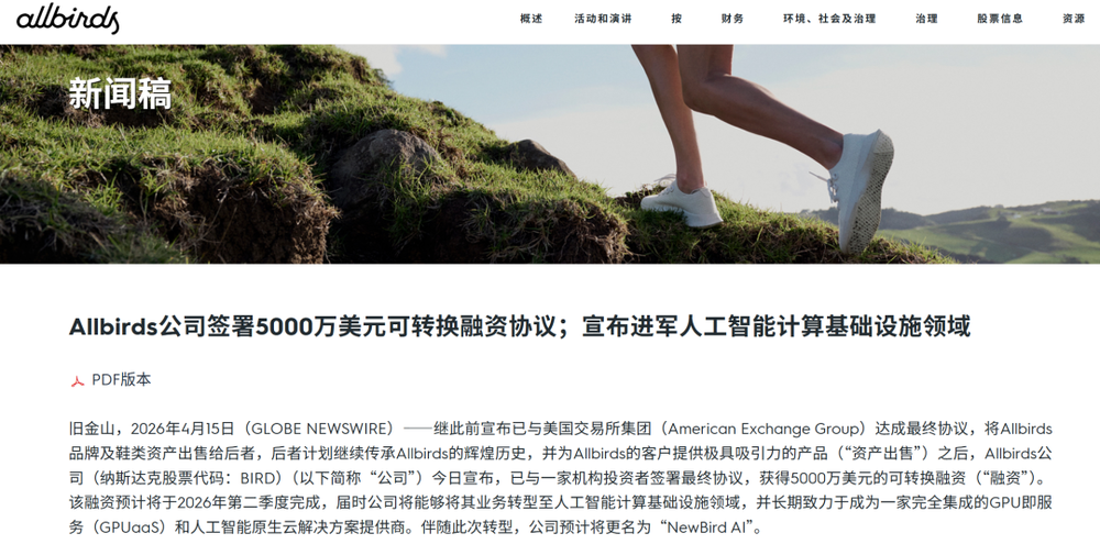 昨夜,相似的剧情再次上演,主角换成了Allbirds。这家企业在投资者关系页面发布公告,宣布彻底放弃制鞋业务,完成5000万美元融资后,将业务重心转向AI算力租赁,计划将新公司命名为NewBird AI。