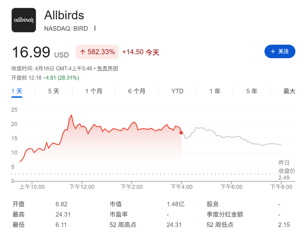 消息一出,Allbirds股价暴涨582%,盘中最高涨幅超7倍。