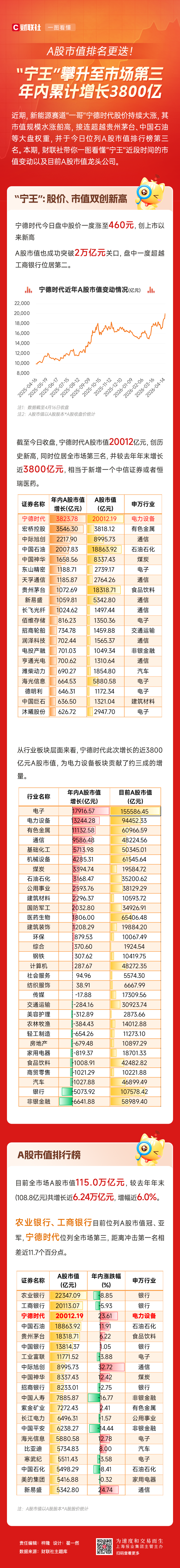 4月16日收盘时,宁德时代的A股市值达到20012亿元,这是其市值首次突破2万亿元,同时创下历史新高,在A股市场的排名上升至第三位,仅次于农业银行和工商银行这两家银行股。