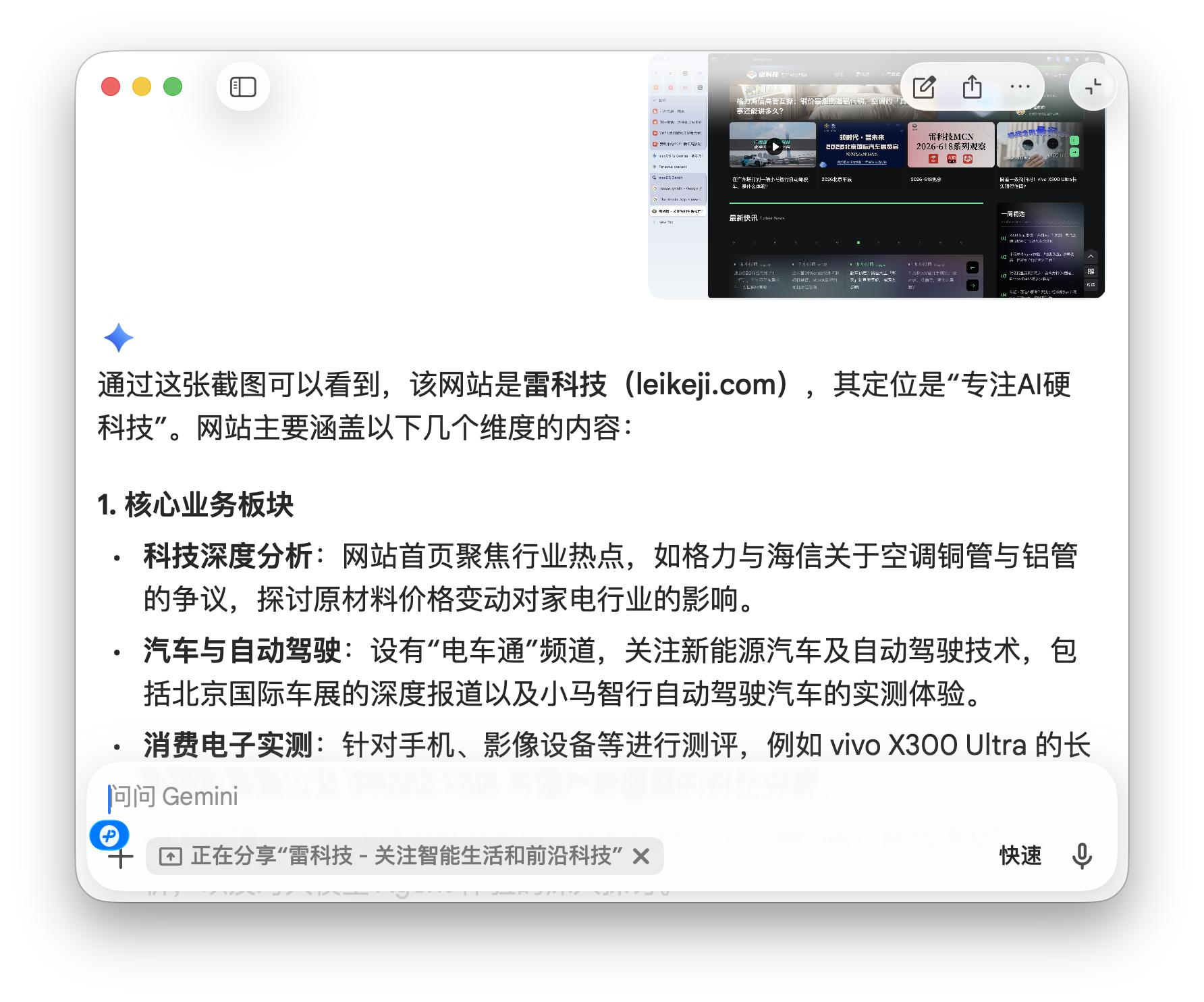 ChatGPT桌面端的类似功能叫「屏幕截图」,但每次都需要手动触发截图,再发起新请求。而Gemini是一次开启后,可在对话过程中持续使用。这在处理文档、表格或网页内容时,会更顺手一些。