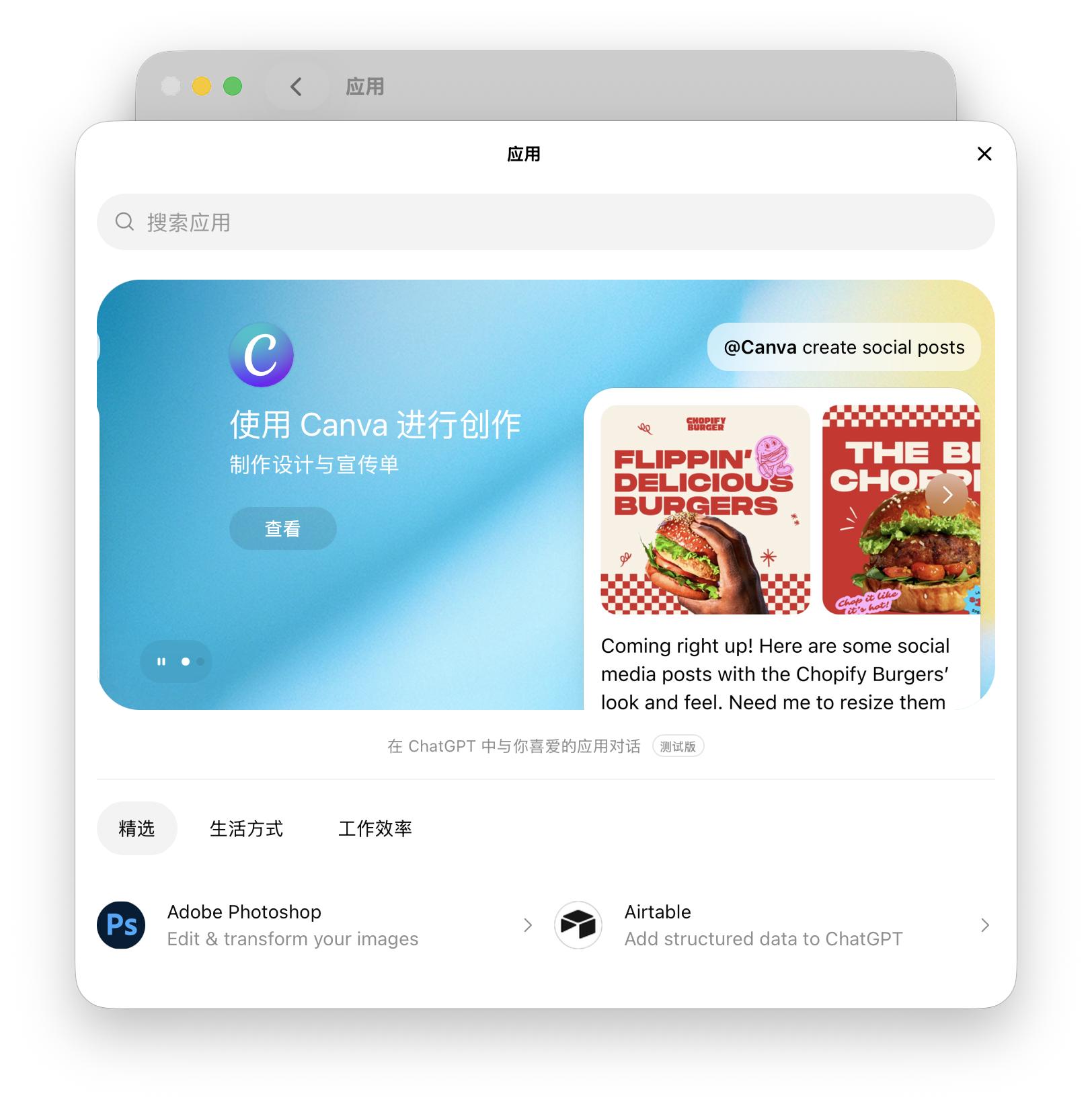 先说说ChatGPT的桌面端,它已不只是一个对话窗口,还在尝试打造以ChatGPT为核心的应用生态。实际使用中,可直接调用macOS本地应用,也能接入一批已打通的第三方工具,比如Adobe Photoshop、Canva、Figma、Apple Music、OpenTable等。