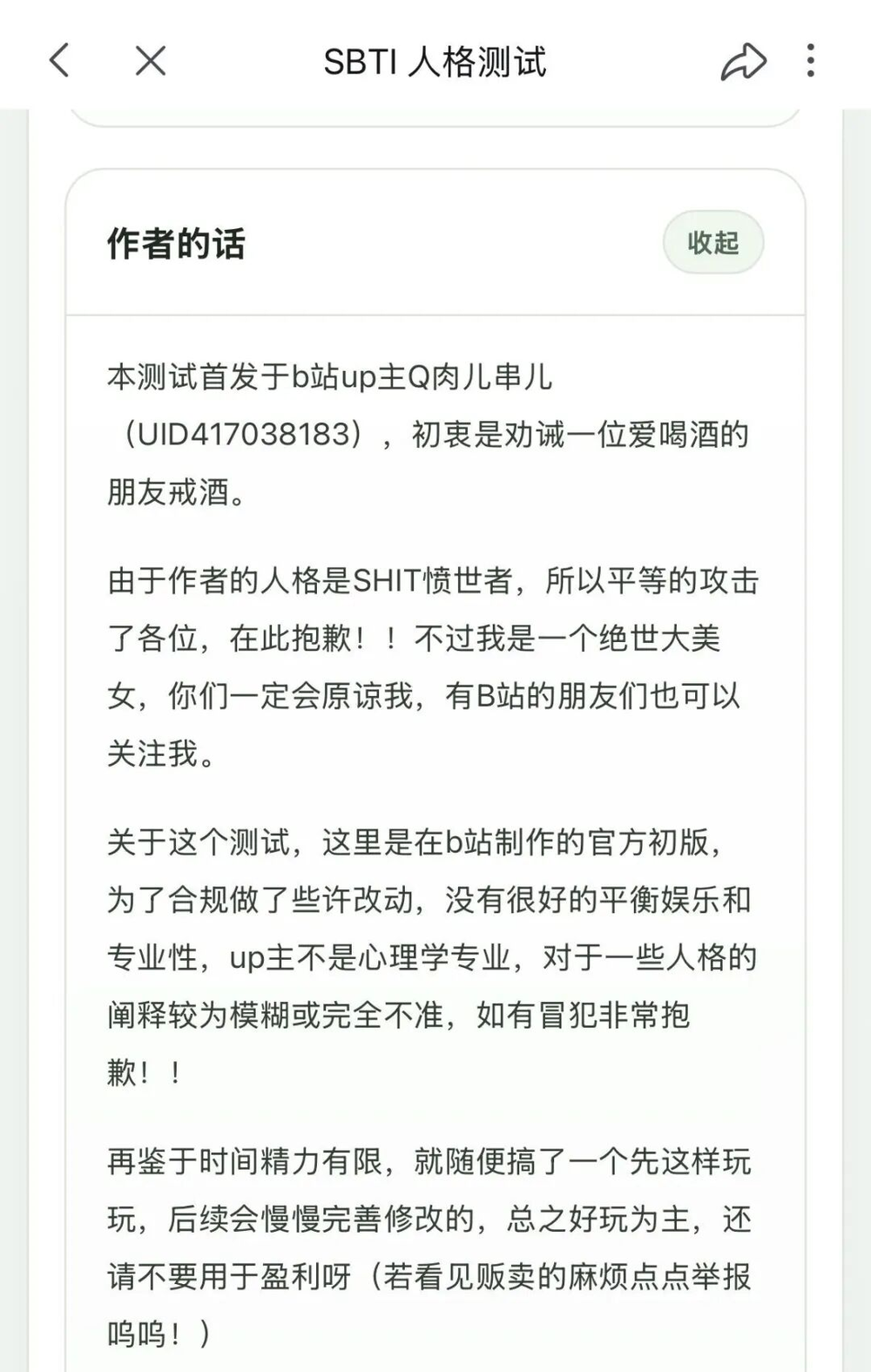 SBTI的走红逻辑不难理解:题目少、无需注册、完全免费。更关键的是,它毫无说教感,作者在测试结尾特意说明:“我非心理学专业,部分人格阐释可能模糊或不准确,仅供娱乐,切勿商用。”