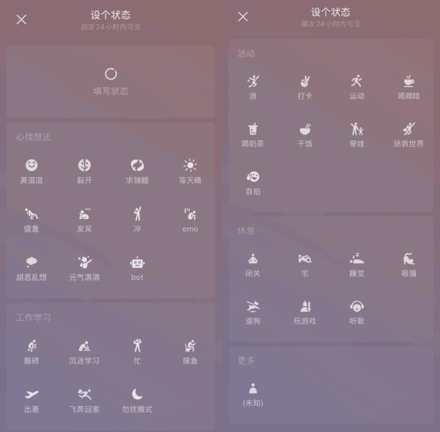 2021年微信推出“状态”功能,提供“美滋滋”“裂开”“摸鱼”“搬砖”等预设标签,用户可随时更新当下心情或活动,有效期仅24小时。微信创始人张小龙说,希望“状态”成为朋友圈的反面,让人不必再“装”。
