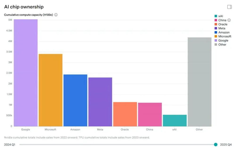 一方面,尽管中国电力资源在存量和增量上都远超美国,但在算力硬件供给上仍逊于美国。根据EpochAI最新统计,按H100当量计算,中国的算力规模仅相当于甲骨文一家公司的水平,远不及谷歌、微软、亚马逊和Meta。