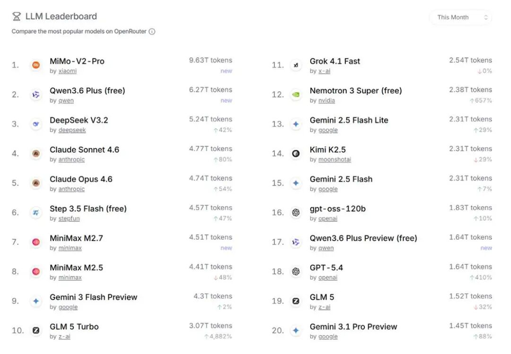 不过情况正在改变。近期OpenRouter排名前二的模型——小米的MiMo-V2-Pro和阿里巴巴的Qwen3.6 Plus(free)均未开源。以小米的模型为例,其唯一服务提供方是小米本身,这应该算“token出海”。