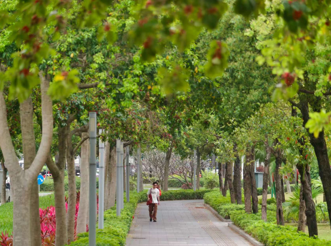 树种选择上,蓬江区坚持“适地适树”原则:乡土树种为主,外来树种为辅。13条林荫大道据此补种秋枫、人面子、澳洲火焰木等2900余棵。